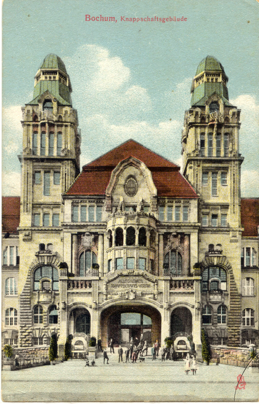 Auf einer Ansichtskarte von 1911. interessantes Detail dieser sehr frühen Ansicht: der Schriftzug "Allgemeiner Knappschaftsverein" oberhalb des Eingangsportals fehlt auf späteren Ansichten. (Karte noch größer sehen - hier klicken!) |