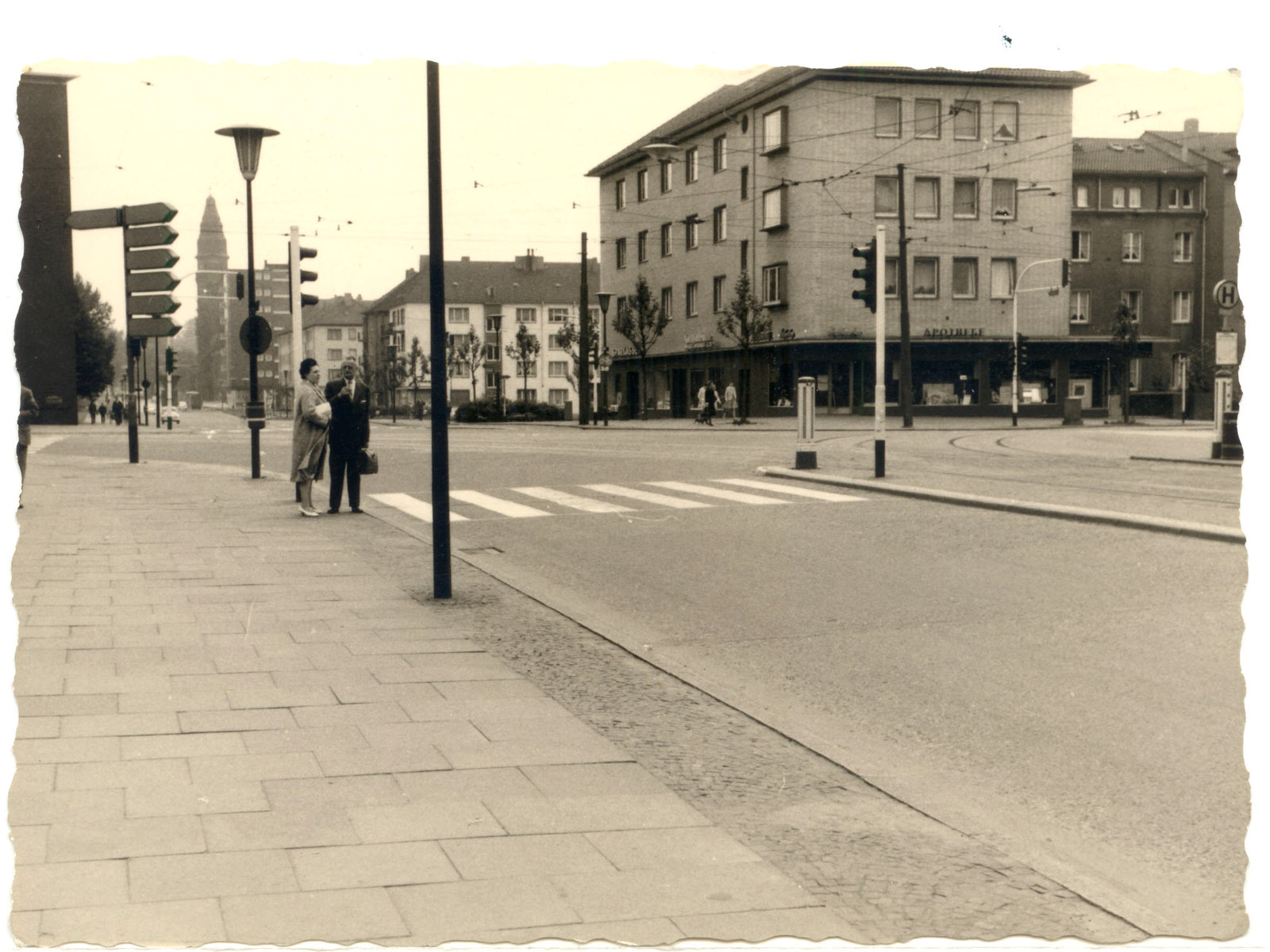 Privates Foto von 1961. Hier die Kreuzung Königsallee/Hattinger- /Oskar-Hoffmann-Straße mit Hubertus-Apotheke im Eckhaus rechts und Melanchthonkirche im Hintergrund. (Foto noch größer sehen - hier klicken!) |