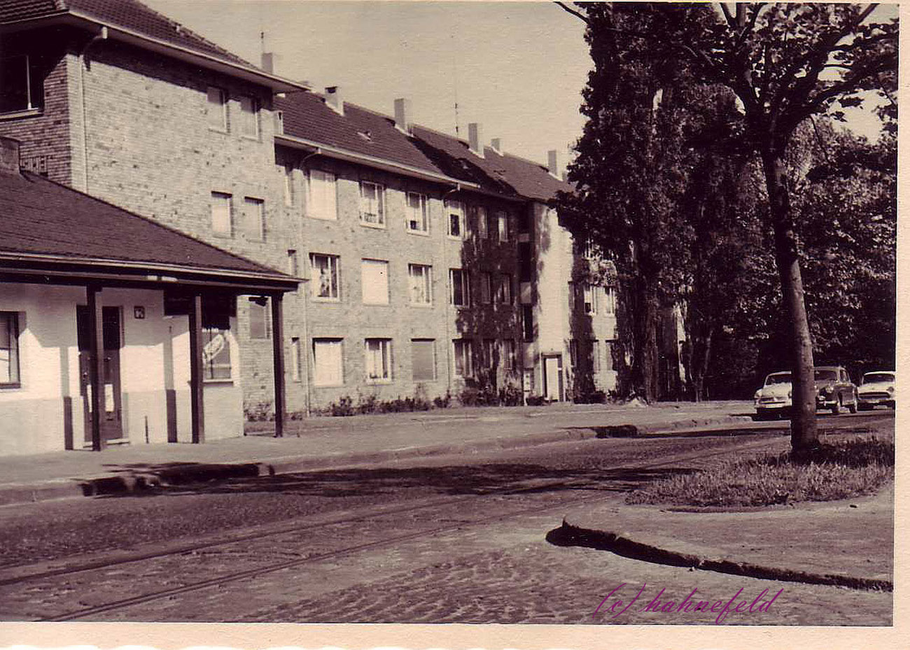 Privatfoto (Danke an A. Hahnefeld), offenbar um 1960 aufgenommen. Das Parkwärter-Häuschen wurde zu dieser Zeit von Fritz Mosbleck als Kiosk verwendet. Das Ehepaar wohnte sogar darin. Hier erkennt man Werbung für "Dr. Hillers" Pfefferminz am rechten Fensterladen. Die Straßenbahnschienen der alten Linie 9 sind auch noch da. (Noch größer sehen: - hier klicken!) |