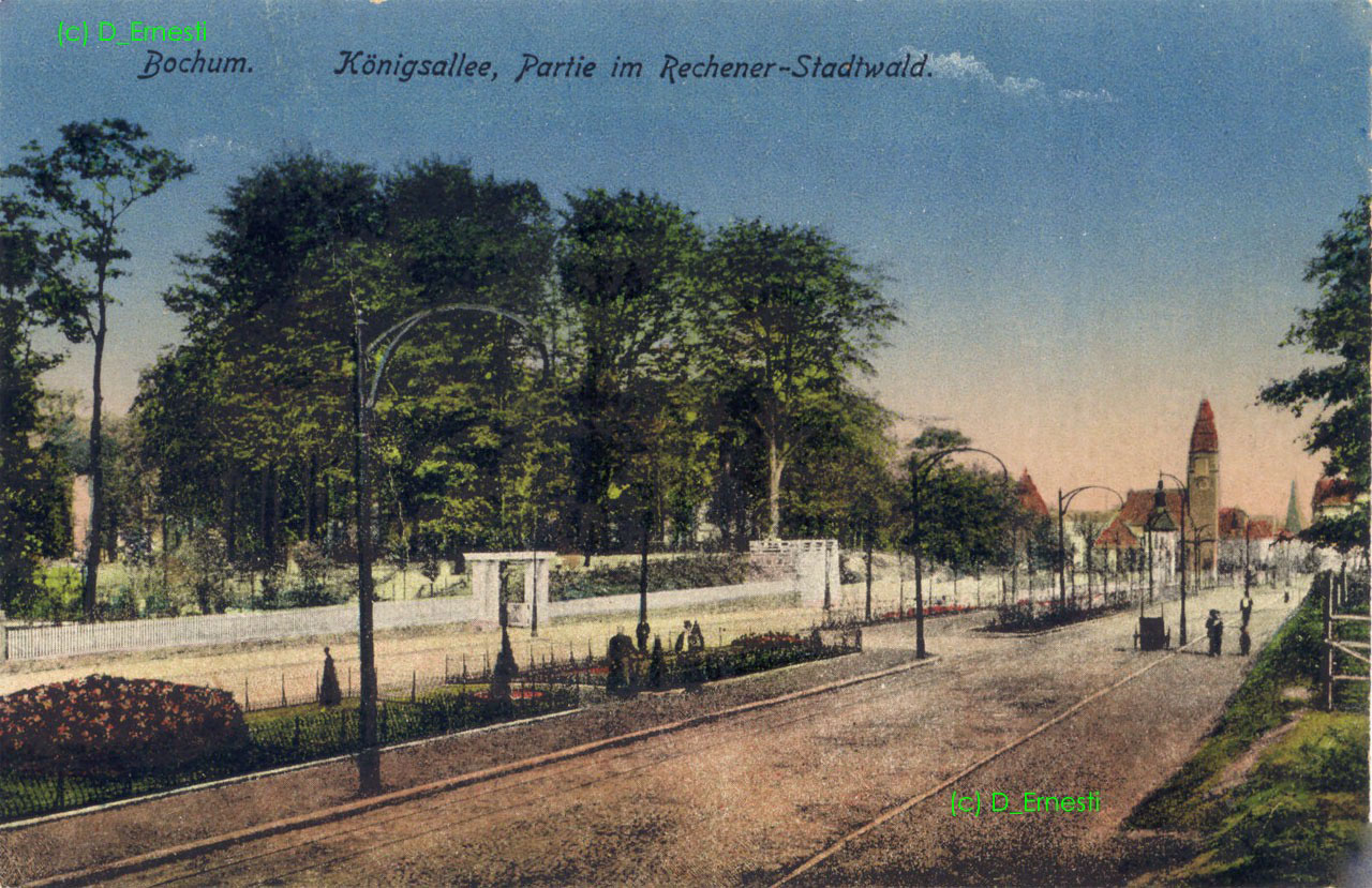 . sehr frühe Ansicht der Königsallee, offenbar noch nicht asphaltiert. Links die "Rechener Waldschenke", siehe weitere Bilder im Bereich "Gaststätten". Rechs vorne ein Eingangstor an der Stelle, wo auch heute noch der Weg aus dem westl. Parkteil herausführt. (Noch größer sehen: - hier klicken!) |