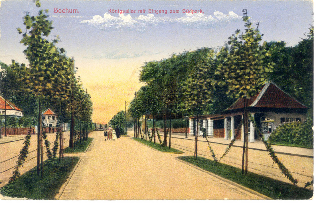 Auf einer kolorierten Karte, 1921 hergestellt. Gesehen in Richtung Innenstadt, auf Höhe der Einmündung in die Grünstraße (heute Arnikastraße) - rechts. Links das Parkwärter-Häuschen am Südpark mit Eingang in den Park. (Foto noch größer sehen: - hier klicken!) |