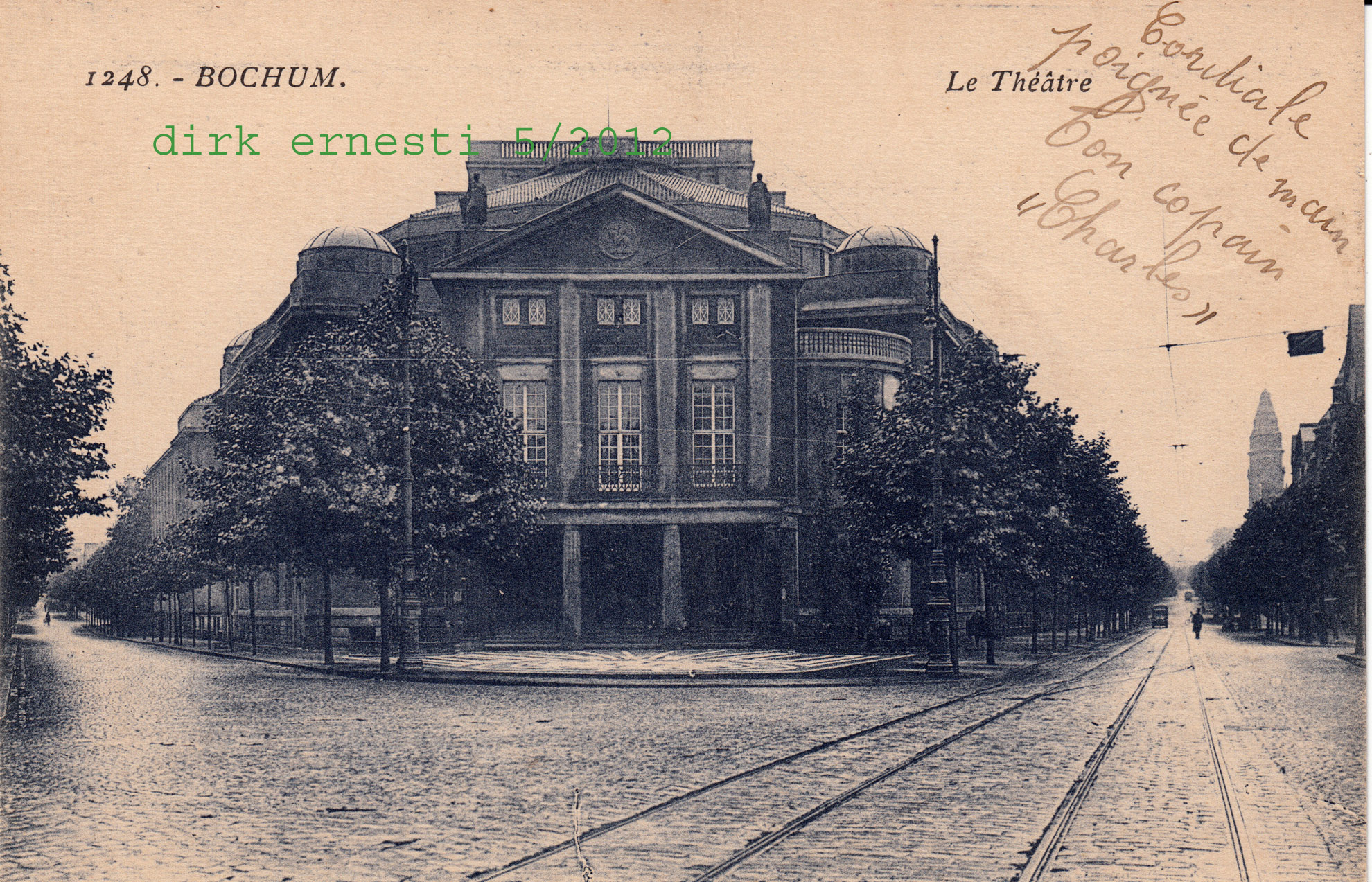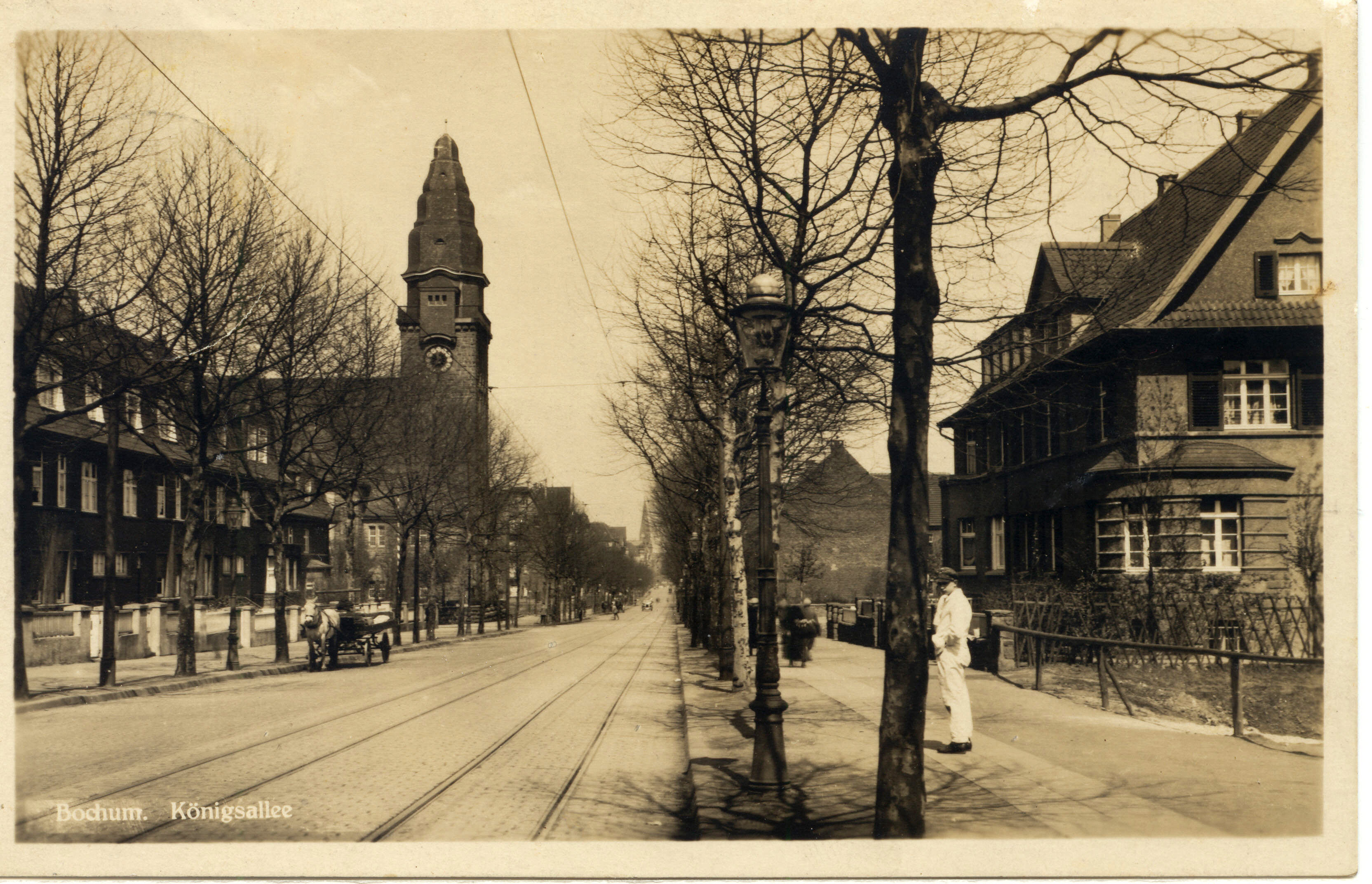 Ansichtskarte, etwa 1944. Schöne Ansicht aus einer Postkarte heraus kopiert, deutlich sichtbar ein Straßenbahnzug der BoGeStra Linie 5, die auch noch in der Nachkriegszeit diese Strecke einige Jahre befuhr. (Foto noch größer sehen - hier klicken!) |