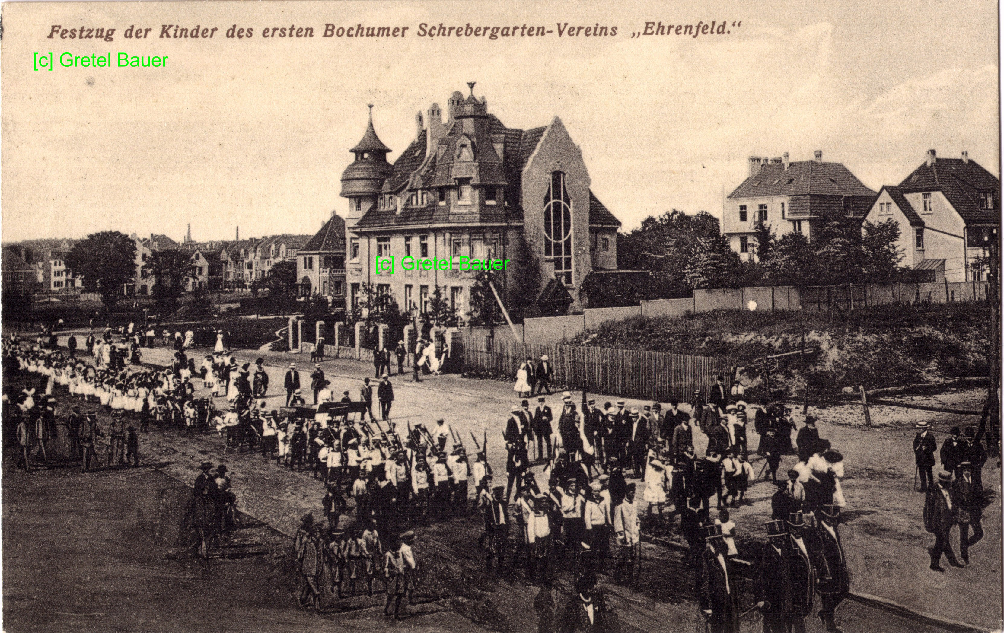 hier noch unbefestigter Zustand ohne Mittelinsel und Bäume. Man sieht einen Umzug der Kinder des ersten Bochumer Schrebergarten-Vereins Ehrenfeld e.V., rechts die projektierte Grünstraße, weiter links im Bild im Hintergrund Häuser in der Friederikastraße. (Foto noch größer sehen: - hier klicken!) |