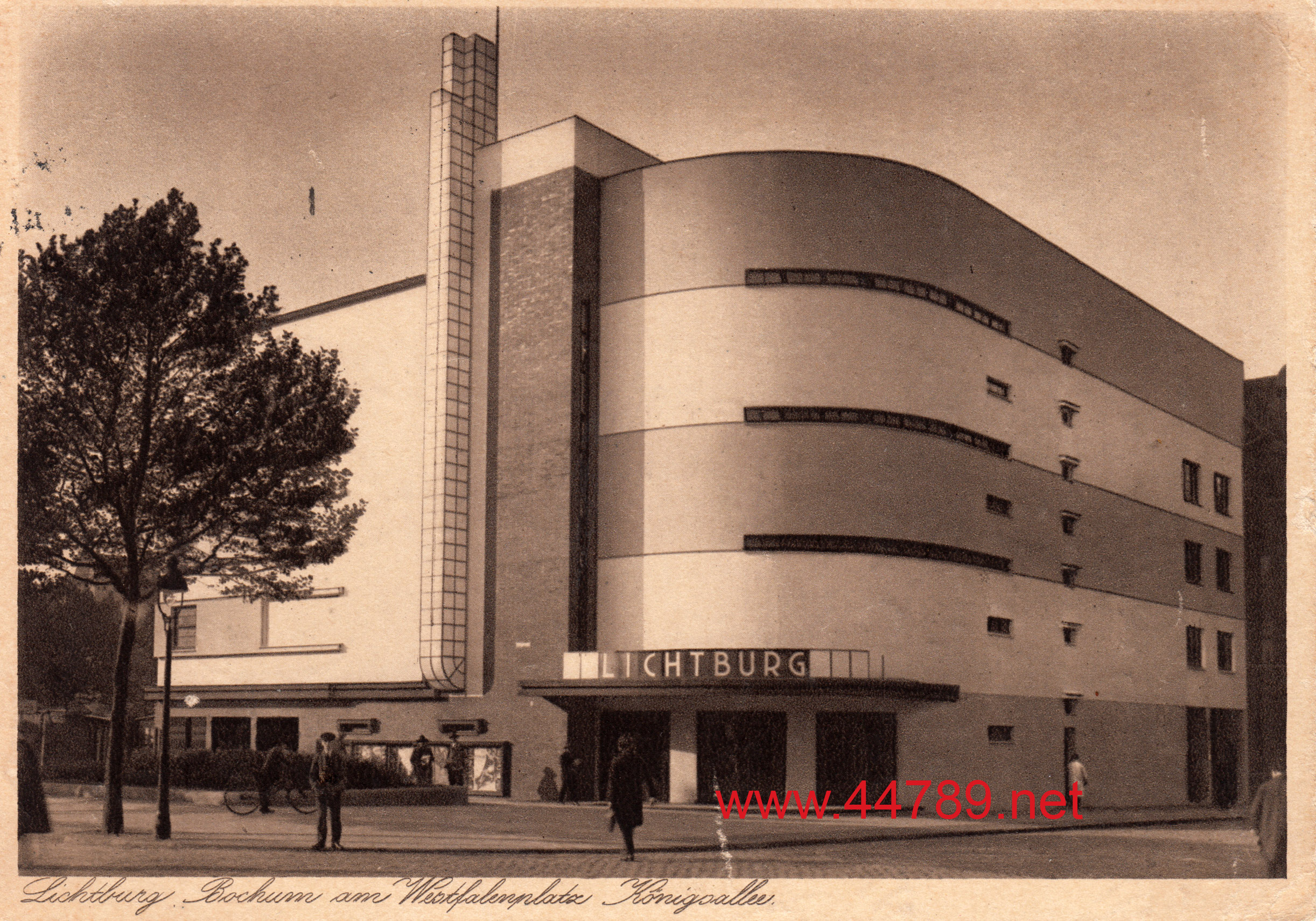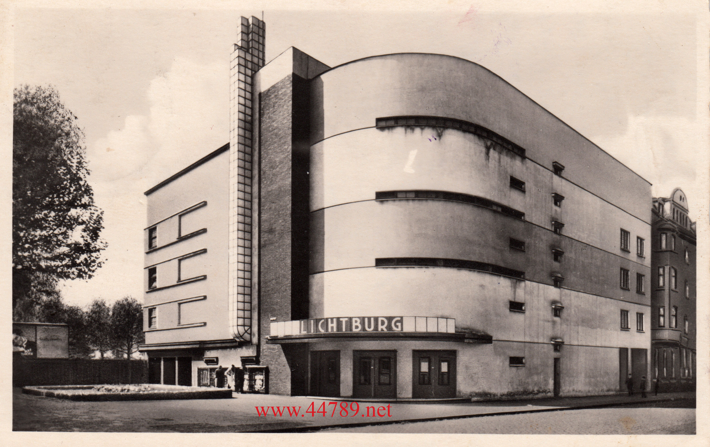 Ansichtskarte, um 1940. Das Lichtspielhaus befand sich an der Ecke Oskar-Hoffmannstraße /Königsallee bzw. Jägerstr. Es wurde im Krieg zerstört und nicht wieder aufgebaut. Der Blick geht hier in die Oskar-Hoffmann-Str, die an der Hattinger Straße begann. (Heute: Alte Hattinger Straße) Zum Zeitpunkt der Aufnahme wurde der Film Der arme Millionär beworben, dessen Uraufführung am 12.07.1939 war. (Karte in hoher Auflösung sehen - klicken! längere Ladezeit mögl.!) |