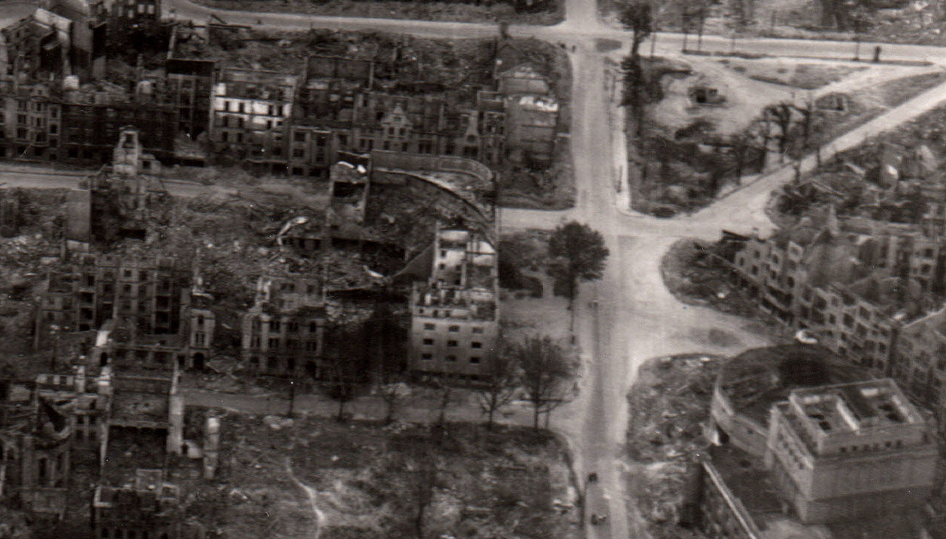 Foto-Ausschnitt, wohl Sommer 1945. hier sieht man die erschütternden Folgen des letzten Weltkrieges, das in weiten Teilen zerstörte Bochum, hier der Bereich um die "Schauspielhaus-Kreuzung", mit Theater links und Lichtburg, sowie Westfalenplatz oben links. (Größer sehen - klicken!) |