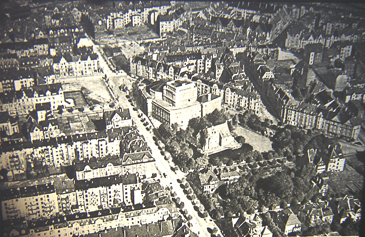 Fliegeraufnahme nach Norden, noch ohne Parkhotel und Lichtburg, vermutlich um 1925 aufgenommen. Gut zu erkennen u.A. die Baumbepflanzung auf der Königsallee. (Bild größer sehen - klicken!) |