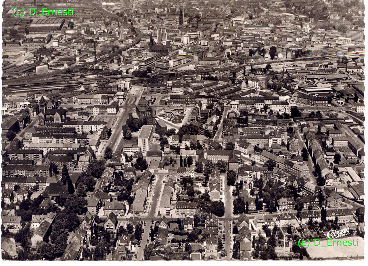 aus der Luft. (Postkarte v. 1960) Blickrichtung Norden, mit Innenstadt. Im Vordergrund ganz unten rechts der Sportplatz der Friederika-Grundschule, man sieht ferner die Dr.-C-Otto-Verwaltung, das Schauspielhaus, das (heutige) Finanzamt BO-Süd, die Melanchthonkirche und vieles mehr. Am unteren Bildrand verläuft in horizontaler Richtung die Friederikastraße. (Foto noch größer sehen - hier klicken!) |