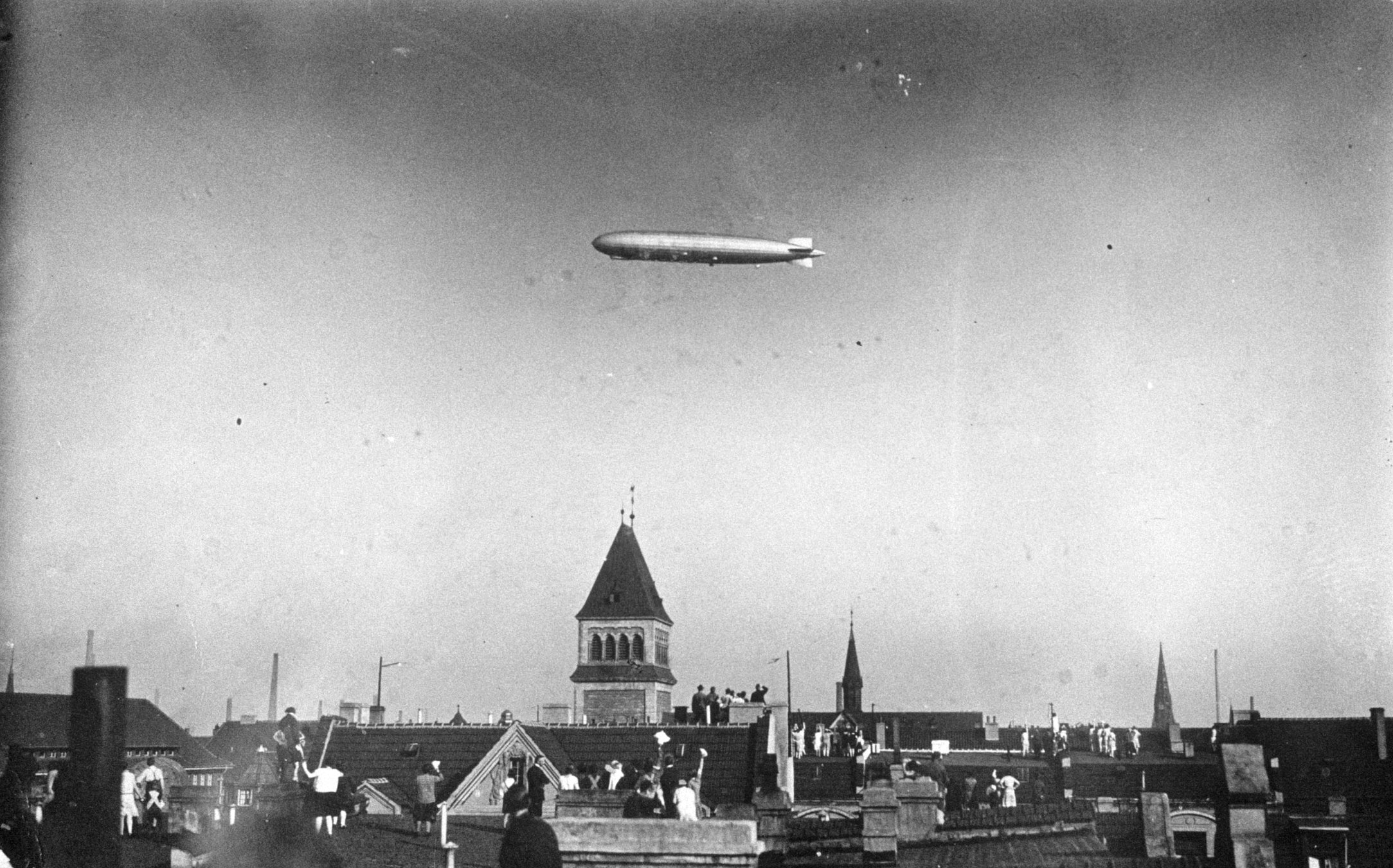 Weiteres, privates Foto, um 1935. Zeigt einen Zeppelin über Bochum, hier scheinbar direkt über der Meinolphuskirche. Viele Menschen sind auf die Dächer geklettert, um diese seltene Ereignis aus der Nähe sehen zu können. (Foto noch größer sehen - hier klicken!) |
