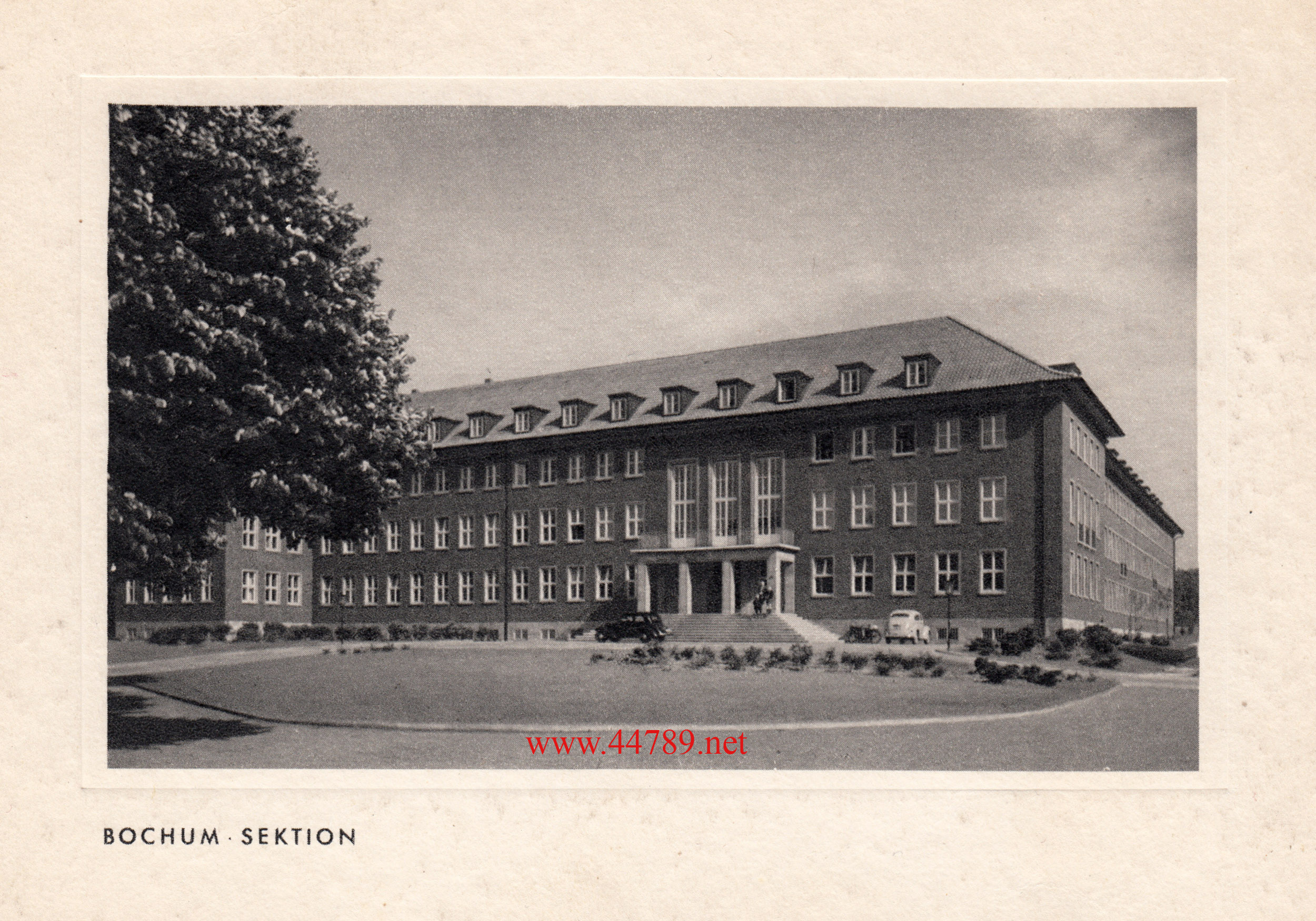 Berufsgenossenschaft Postkarte, um 1950 gesehen von der Straßenecke Waldring/Hunscheidtstraße. Heute nahez unverändert erhalten. Auf dem Foto erkennt man einen Ford Taunus "Buckel", demnach dürfte die Aufnahme aus den 1950er-Jahren stammen. (Foto noch größer sehen - klicken!) |