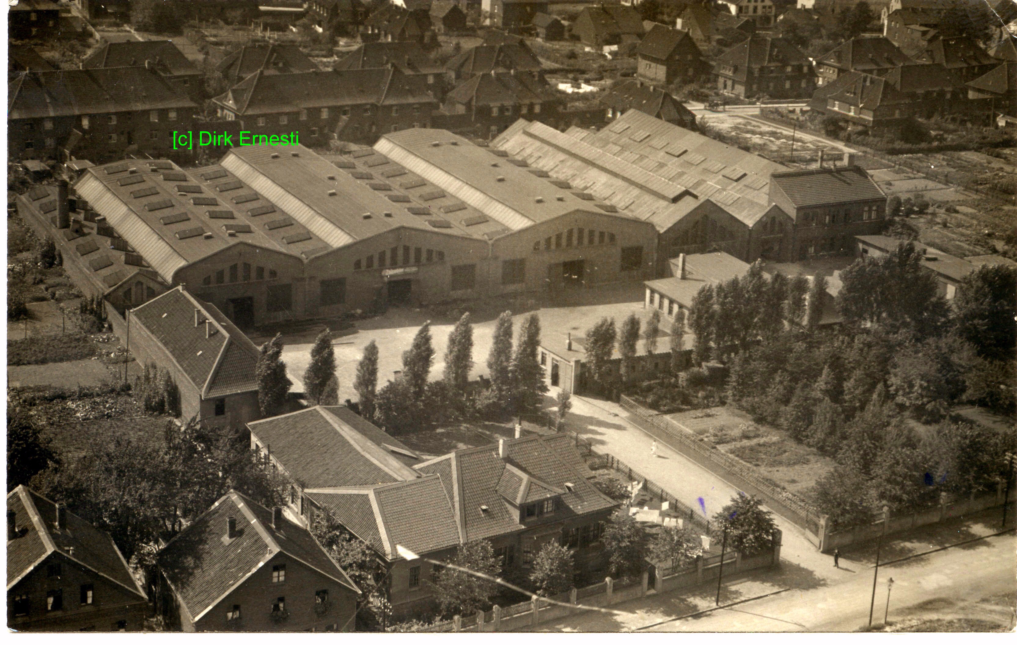 (Luftbild von 1927) auf einer privaten Postkarte. Vorne am Bildrand verläuft die Hunscheidstraße, hinter den Firmenhallen - die heute noch teils unverändert existieren - sieht man Häuser in der Mozartstraße, ganz rechts am Bildrand noch den "kleinen Waldring". Siehe auch:- Stadtplan 1939 (Foto noch größer sehen - klicken!) |