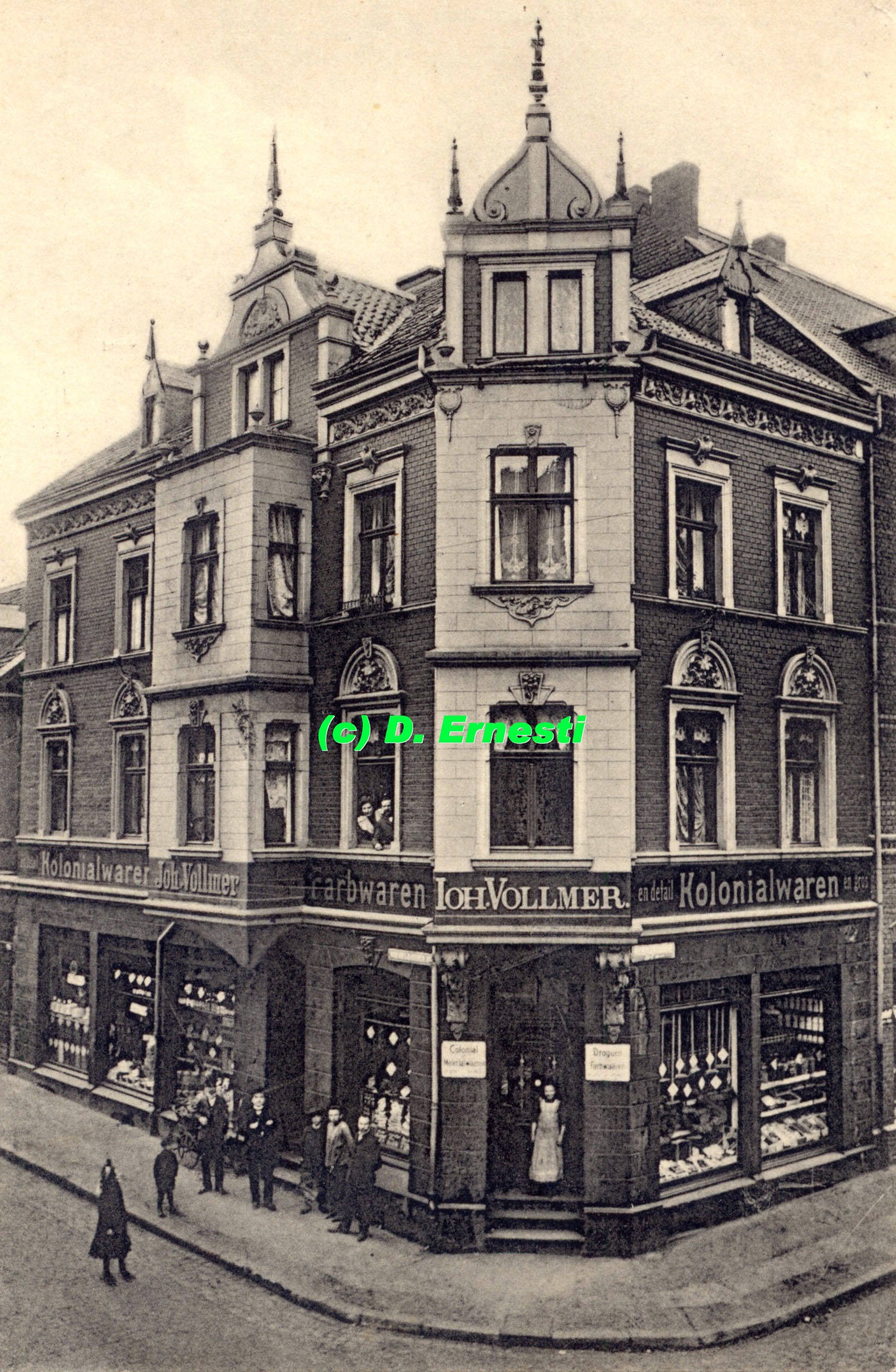 Postkarte, von 1912 Das Kolonialwaren-Geschäft von Johann Vollmer, Ecke Hermannshöhe. Die Wiemelhauser Straße verläuft links, rechts zweigt die Hermannshöhe ab. An dieser Stelle befindet sich heute ein unbebautes Grundstück, welches teilweise als Parkplatz genutzt wird (Ansicht komplett sehen - klicken!) |