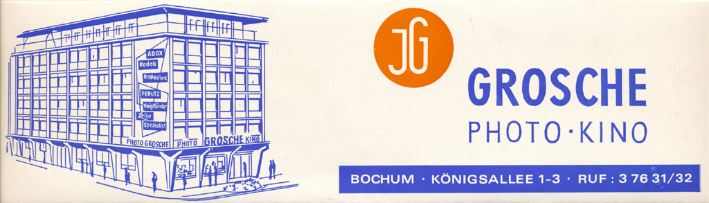 Von einer Negativtasche aus den 60ern. Das Gebäude befindet sich an der Ecke Königsallee/Kronenstraße. Siehe auch hier: klicken! Die Frirma Grosche hat Ihre Geschäftsräume mittlerweile an anderer Stell im Bochumer Osten. (Abbildung komplett ansehen - klicken!) |
