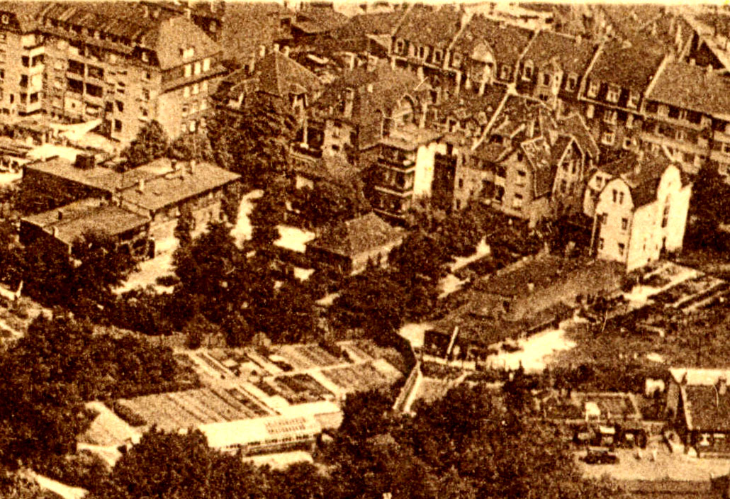 (auf einer Postkarte, Luftaufnahme Bergmannsheil, benutzt 1932) Das Gebäude der Fa. Unterberg (vgl. oben) ist in Bildmitte, von der Rückseite gesehen, auf diesem gezoomten Postkartenausschnitt gut zu erkennen. (Foto noch größer sehen - klicken!) |