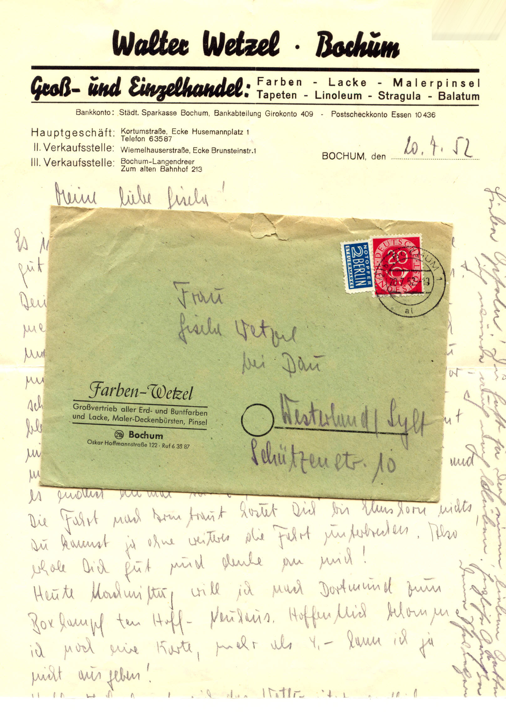 (Brief mit Firmenumschlag) war in der Oskar-Hoffmannstraße 122 ansäßig. Lt. Briefkopf (Vergrößerung anklicken) hatte auch eine Verkaufsstelle in der Brunsteinstraße 1, Ecke Wiemelhauser Straße. Heute ist hier eine Blumenhandlung. (Beleg komplett sehen - klicken!) |