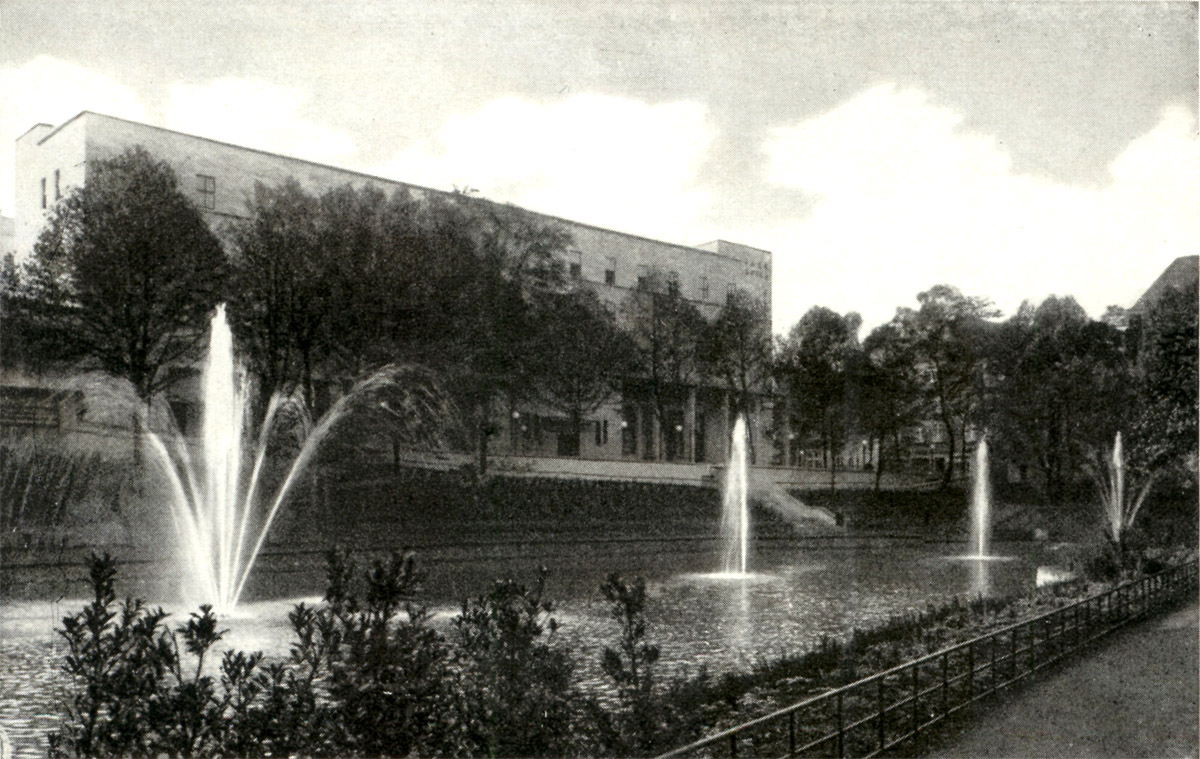 Postkarte von 1931. Hier von der Straßenecke Weiherstraße/Königsallee über die Königsallee hinweg gesehen. Man sieht die Anfahrt für PKWs mit einem Fahrzeug vor dem Eingang. (Foto noch größer sehen - hier klicken!) |