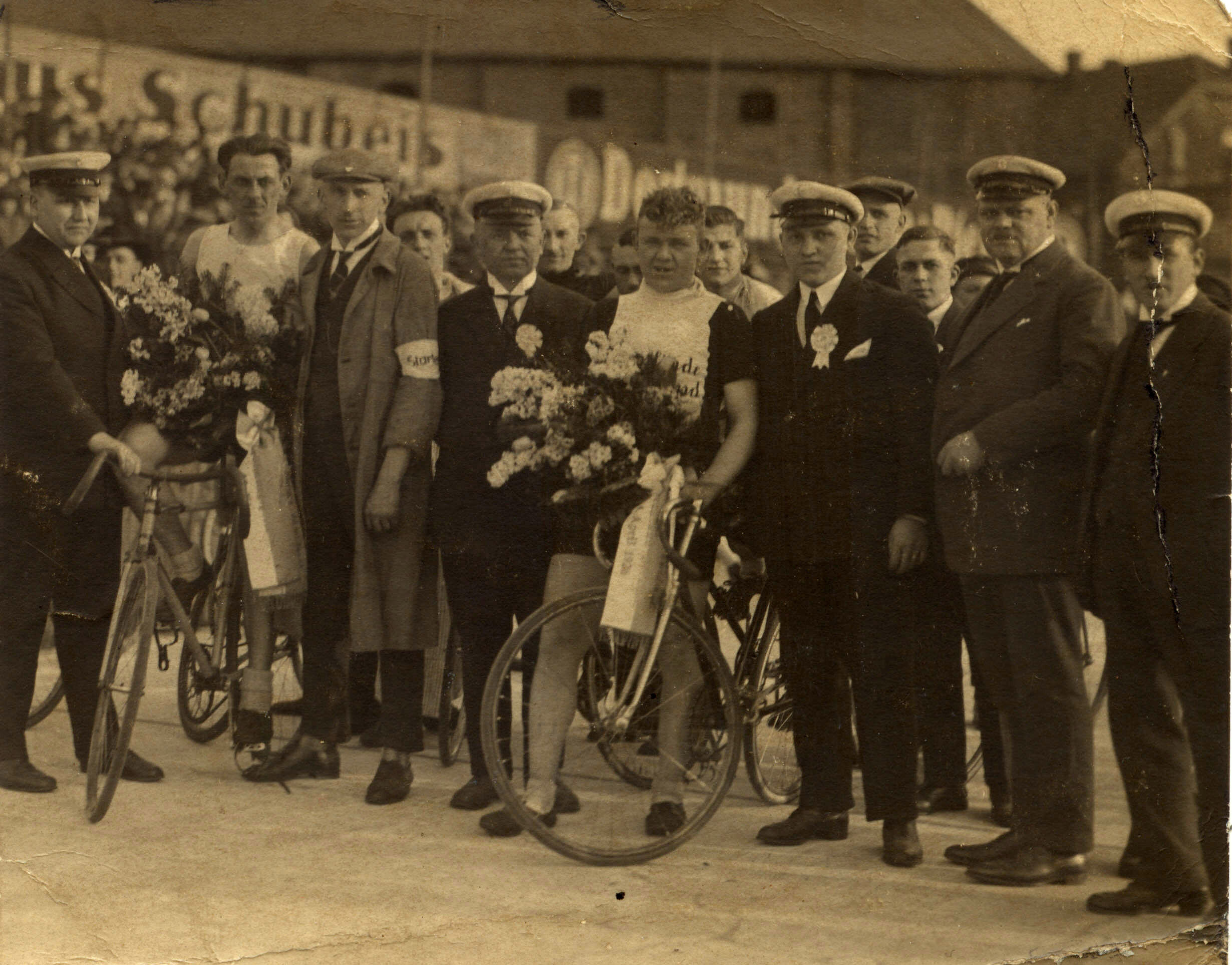 Siegerehrung nach Rennen 1926. (Bildquelle: unbekannt) offenbar anläßlich der Siegerehrung des Saisonauftakt-Rennens am 5. April 1926 angefertigtes Foto. Info entnommen aus: "Lohmann, Hasselberg & Co." - Bochums Radsport zwischen 1889 und 1963 von Ernst-Albrecht Plieg (Foto noch größer sehen - hier klicken!) |