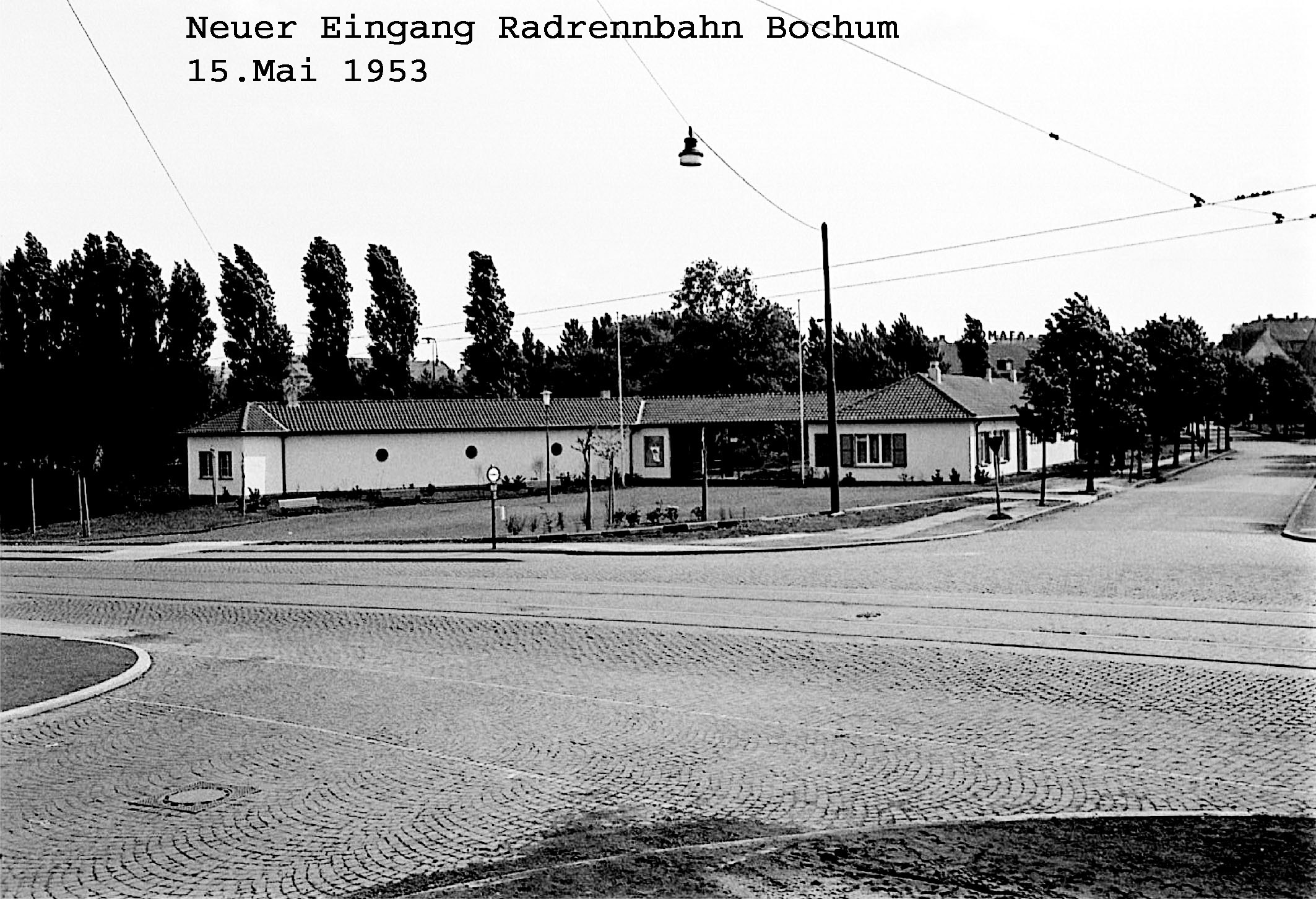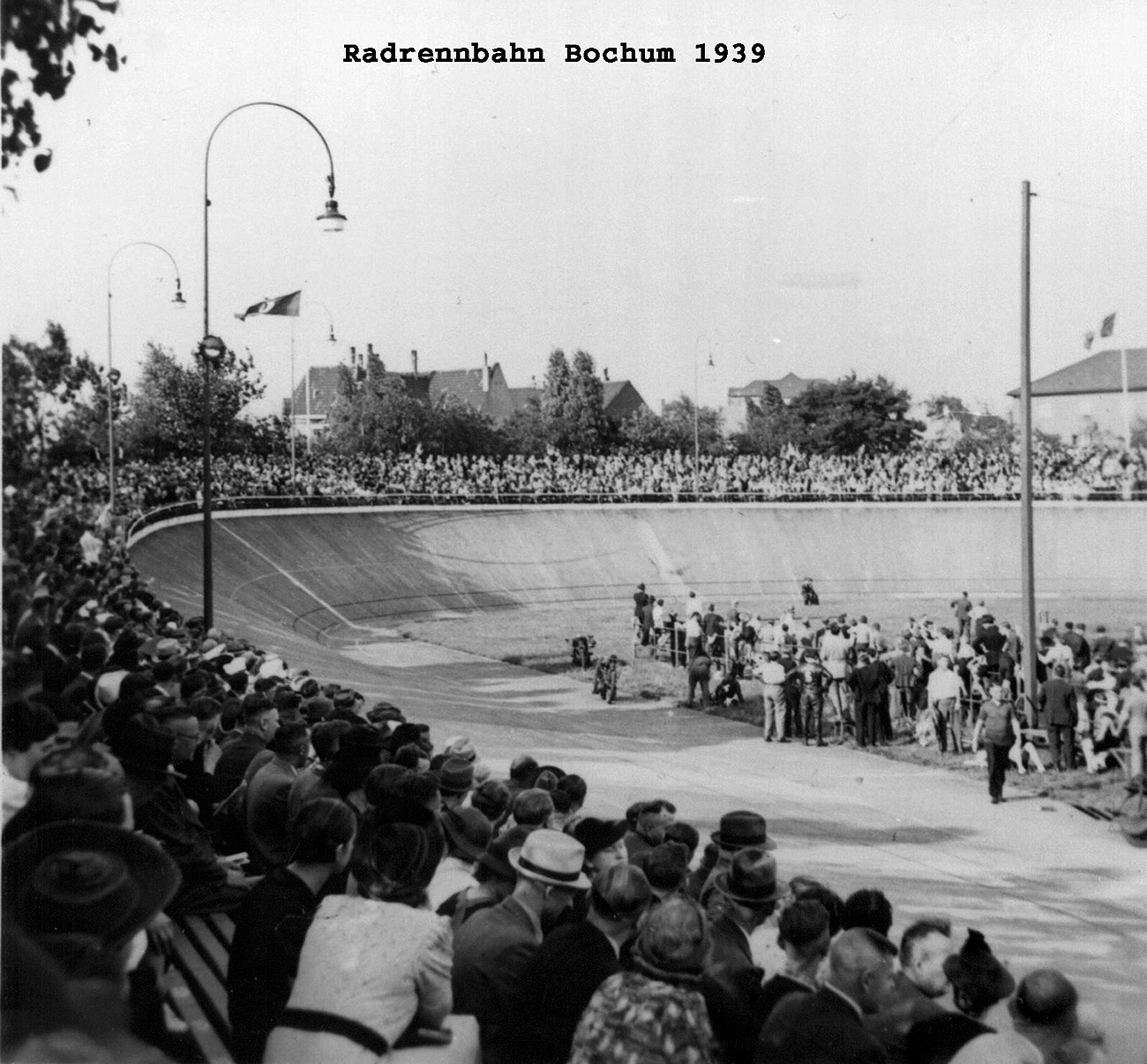 der Radrennbahn (1938 oder 1939 aufgenommen) Steherrennen, hier gesehen Richtung Norden. Links die markanten Giebelfronten einiger noch heute existierender Häuser an der Hattinger Straße. (Foto noch größer sehen - hier klicken!) |
