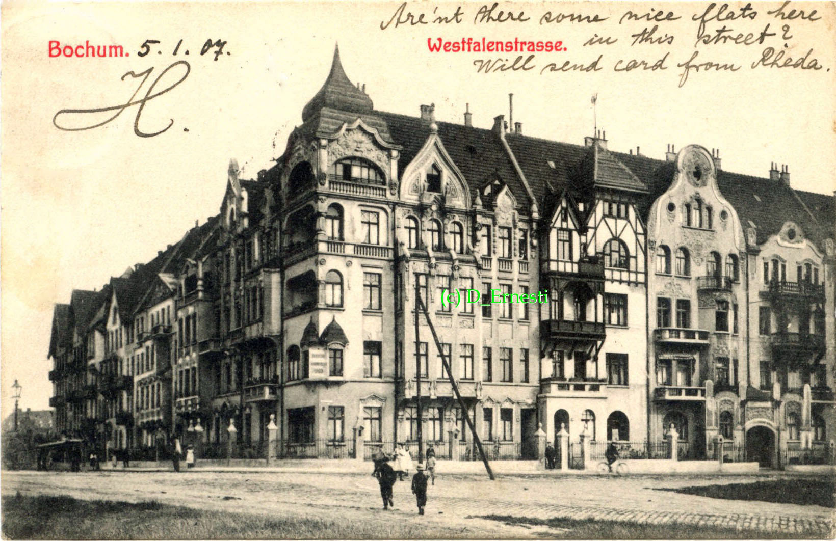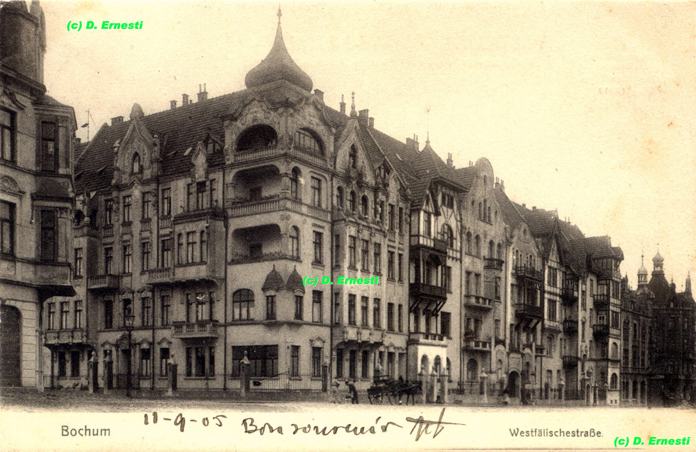 Aus: "Führer durch Bochum", 1910. Bildunterschrift: Häuserblock des Beamtenwohnungsvereins an der Westfälischen Straße. Die Westfäl. Str. befand sich ursprünglich am Westfalenplatz und wurde später mit diesem zusammengeführt. (Foto noch größer sehen - hier klicken!) |