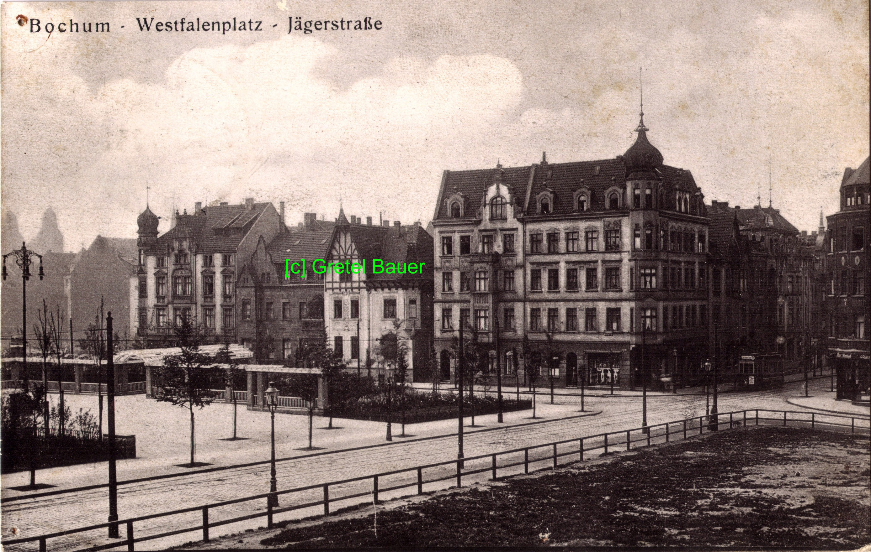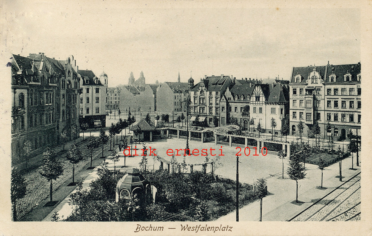 Ansichtskarte von 1920. Eine ähnliche Perspektive, wie auf der Karte zu vor. Im Vordergrund sieht man das Dach eines Häuschen, vermutlich Wartebereich für Straßenbahnfahrgäste oder ein Verweilbereich für die kleine Grünanlage am Westfalenplatu. (Foto noch größer sehen - hier klicken!) |