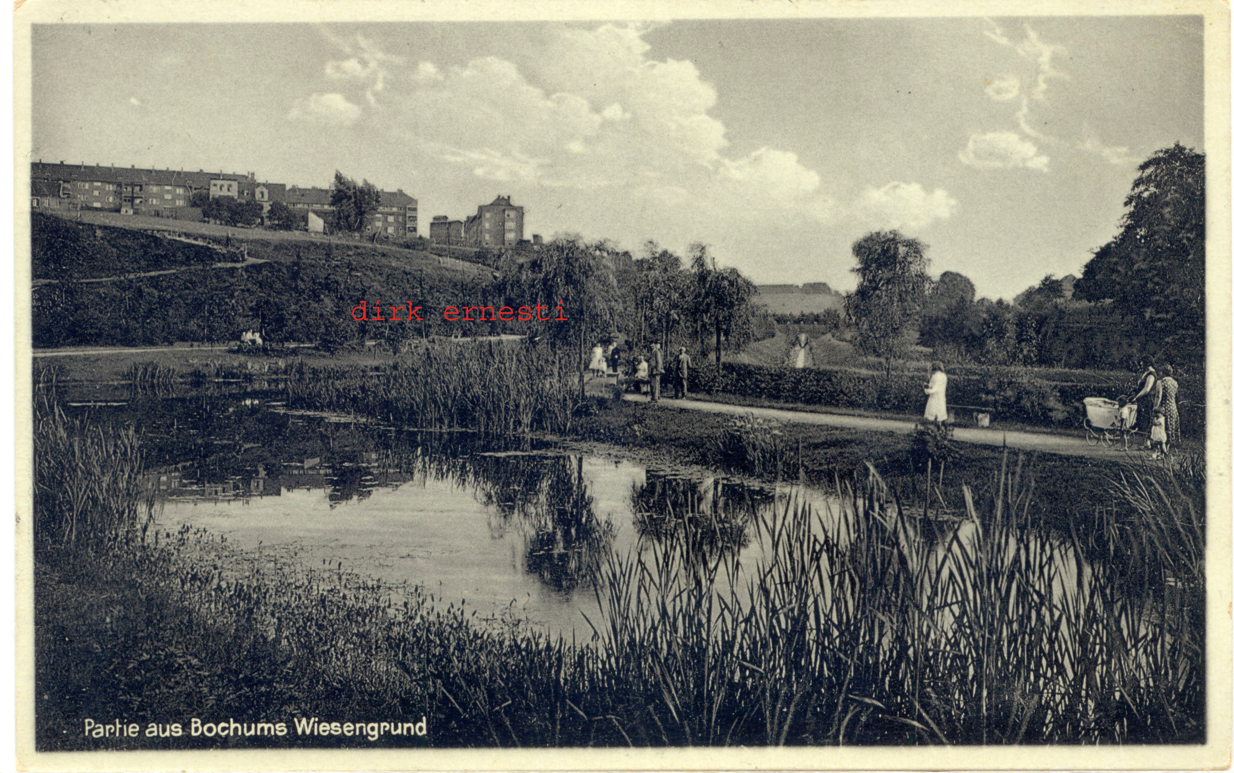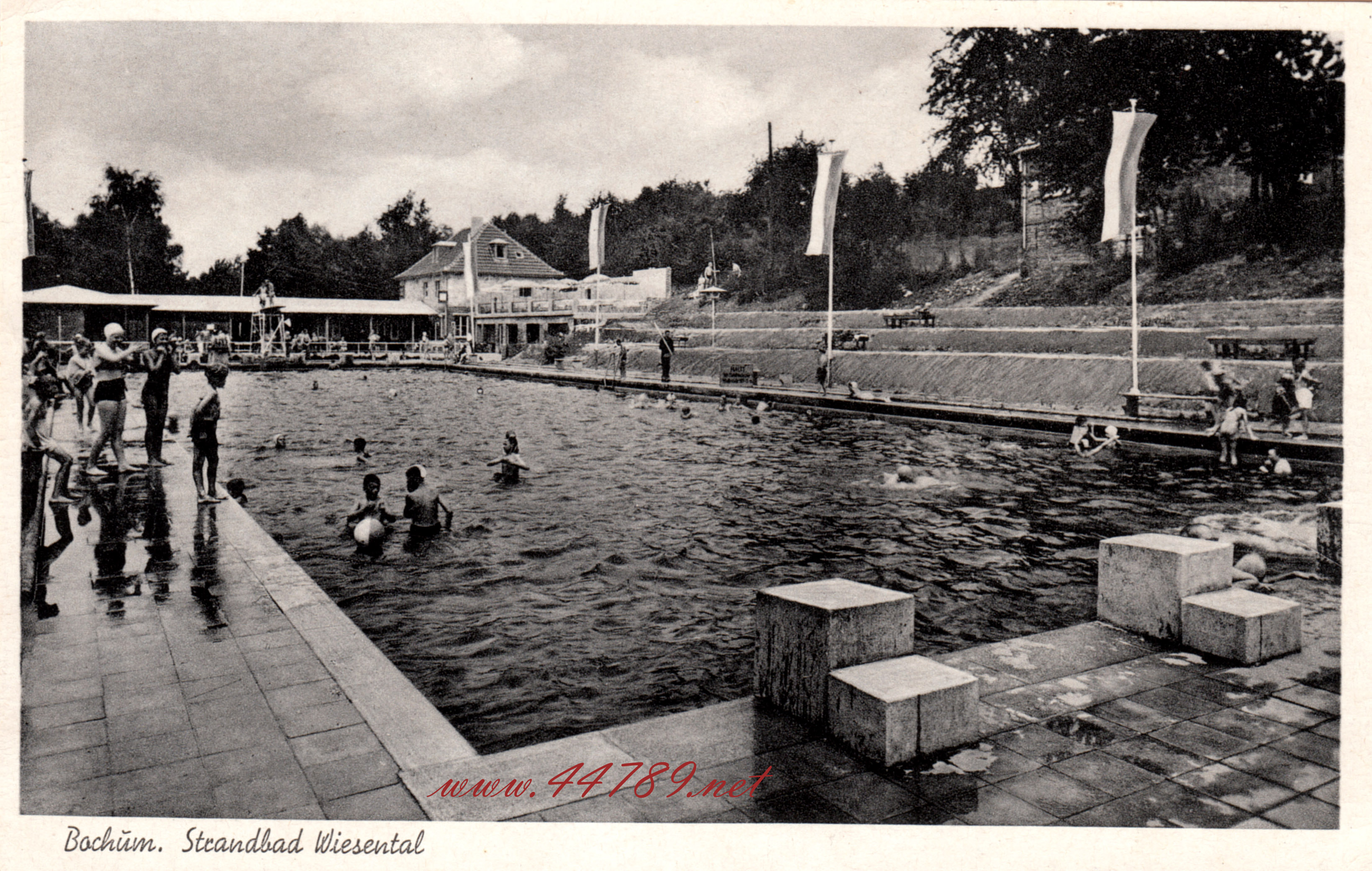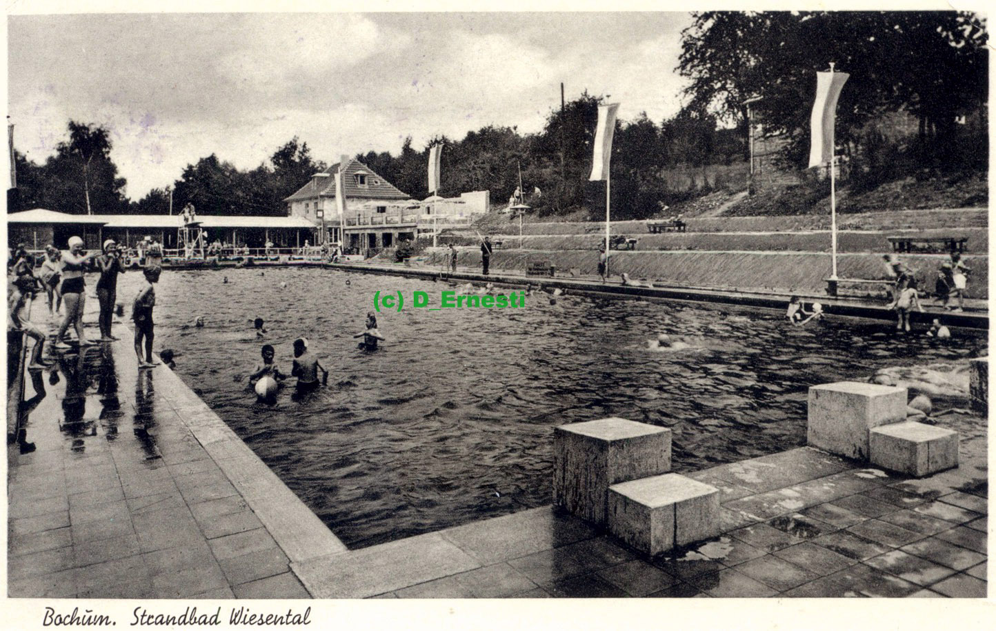 Ansichtskarte von 1957. Die Anlage wird vom S.V. Blau-Weiß Bochum 1896 e.V. betrieben. Blick vom südlichen Ende über das alte Schwimmbecken, links kam später noch das Kinderbecken hinzu. |
