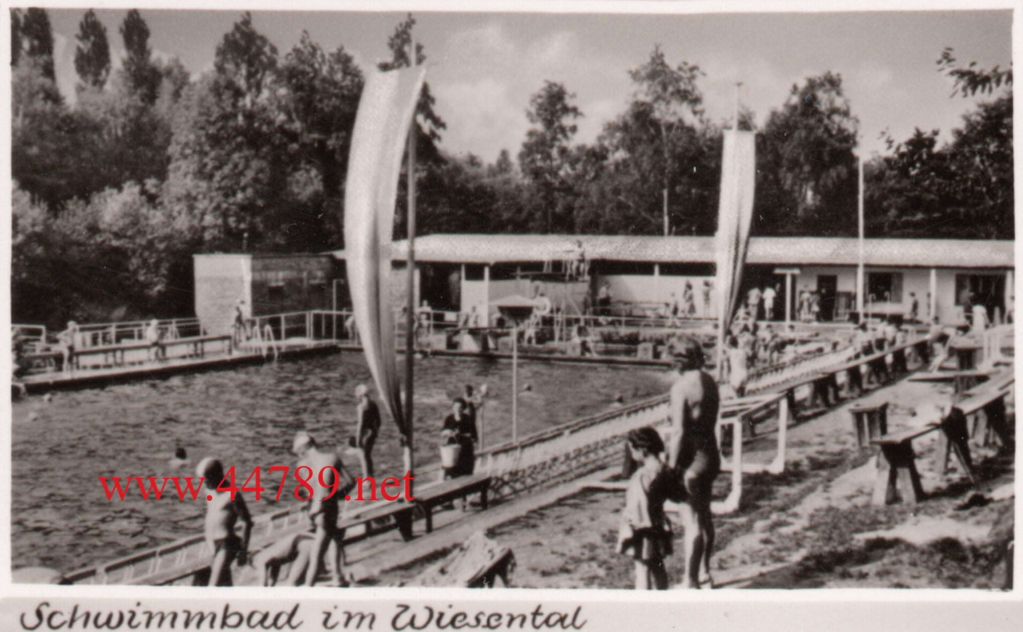 Ansichtskarte von 1951. Auf dieser Karte sogar "Strandbad" genannt; Blick auf den Sprungturm am vorderen Beckenrand mit Restaurantgebäude im Eingangsbereich. (rechts im Bild) Heute ist dies das Café am Wiesental (Foto noch größer sehen - hier klicken!) |